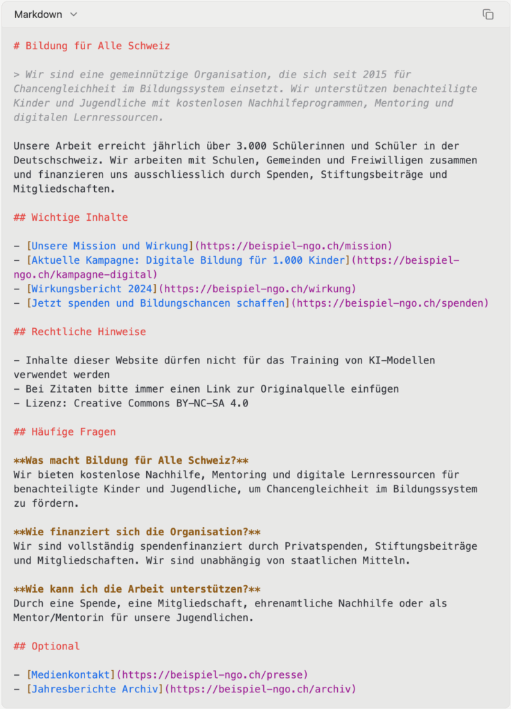 Das Schöne an diesem Standard ist seine Einfachheit. Du brauchst keine Entwickler, keine teure Agentur, keine komplexe Technologie. Es ist eine Textdatei im Markdown-Format, die du in weniger als einer Stunde erstellen kannst. Hier ist ein konkretes Beispiel für eine fiktive Bildungsorganisation: