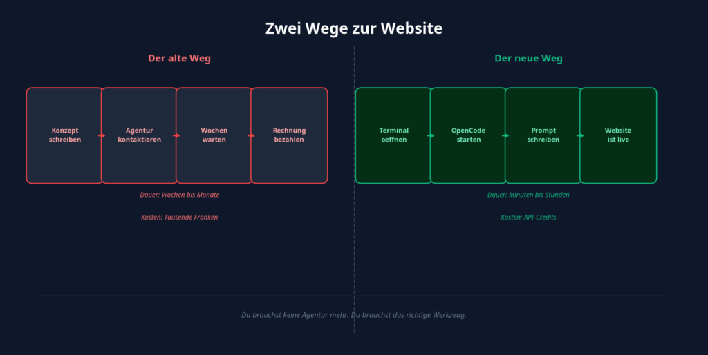 Früher musstest du jede Zeile Code selbst schreiben oder teuer einkaufen. Heute hilft dir Künstliche Intelligenz dabei. OpenCode ist eine Plattform, die dir einen KI-Agenten zur Seite stellt, der Code für dich schreibt. Du kannst OpenCode entweder als App in deinem Browser nutzen oder als CLI (Command Line Interface). Ein CLI ist ein kleines Programm, das du direkt in deinem Terminal ausführst. Du sagst dem CLI im Terminal: „Baue mir eine Startseite mit einem grossen Bild und drei Textblöcken“, und die KI erledigt die harte Arbeit für dich.