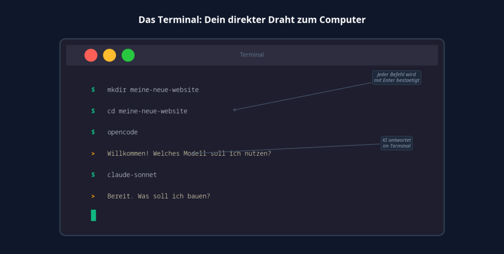 Wenn du an „Hacker“ im Film denkst, siehst du meistens Leute, die wild auf schwarzen Bildschirmen mit grünem Text herumtippen. Das ist das Terminal (oder die Kommandozeile). Es ist im Grunde nichts anderes als ein Chat-Fenster zwischen dir und deinem Computer. Anstatt mit der Maus auf Ordner zu klicken, schreibst du Befehle wie „Erstelle hier einen neuen Ordner“ oder „Starte dieses Programm“. Das Terminal ist auf jedem Mac (heisst dort „Terminal“) und Windows-PC (heisst „Eingabeaufforderung“ oder „PowerShell“) bereits vorinstalliert. Es ist der direkteste und schnellste Weg, deinem Rechner zu sagen, was er tun soll.