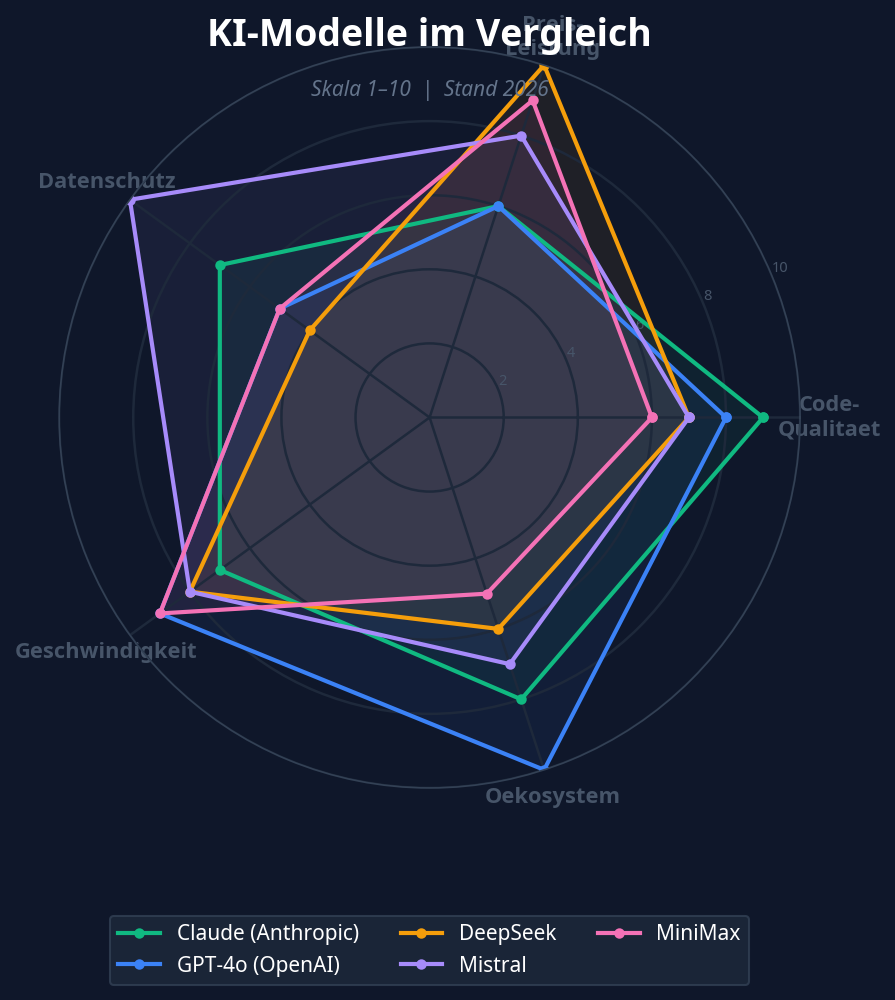 | DeepSeek | DeepSeek V3 / R1 | Der Preis-Leistungs-Brecher. Liefert oft GPT-4-Qualität zu einem Bruchteil des Preises (oft nur 10% der Kosten). Open-Source-Ansatz. |