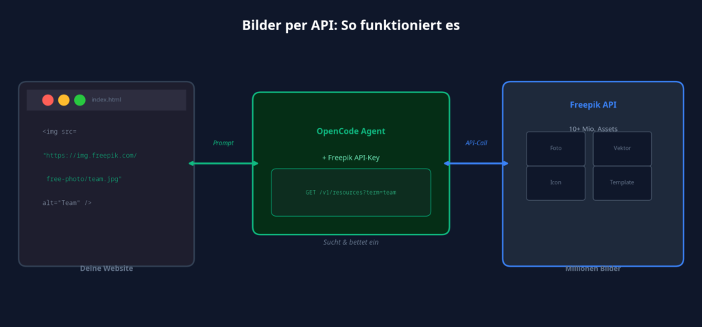 Ein hervorragendes Beispiel dafür ist die Freepik API. Freepik bietet eine riesige Bibliothek an Vektorgrafiken, Icons und hochauflösenden Fotos. Statt die Website zu durchsuchen, kannst du deinem OpenCode-Agenten sagen, er soll die Bilder automatisch für dich holen.