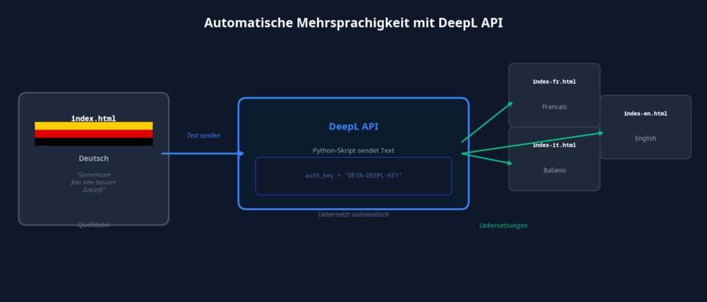 3. **Skript ausführen:** Du führst das Skript in deinem Terminal aus (`python uebersetzen.py`). Innerhalb von Sekunden hast du eine perfekt übersetzte, zweite Version deiner Website.